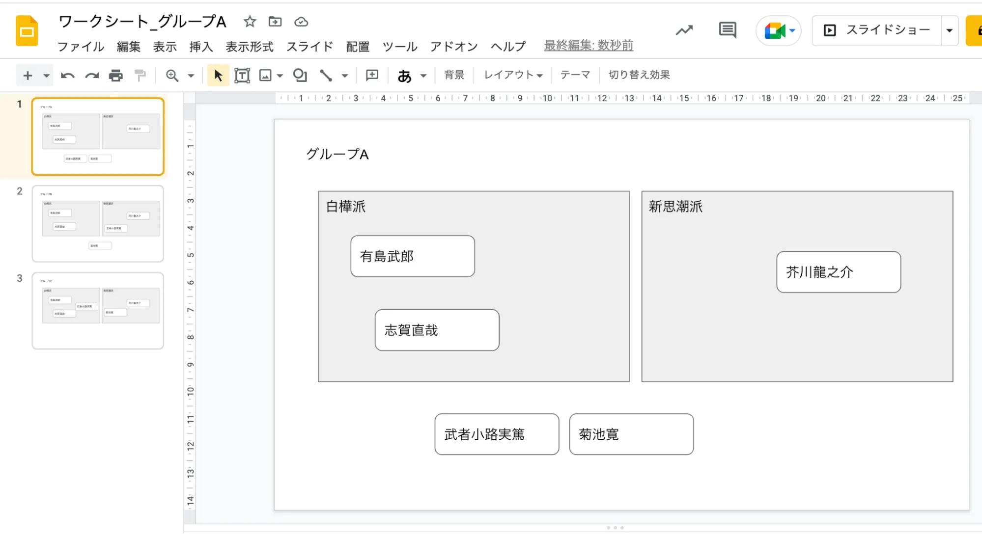 予めワークシートのテンプレートをグループの数に合わせて用意しておくと,URLを配布してすぐにディスカッションを始めることができます.