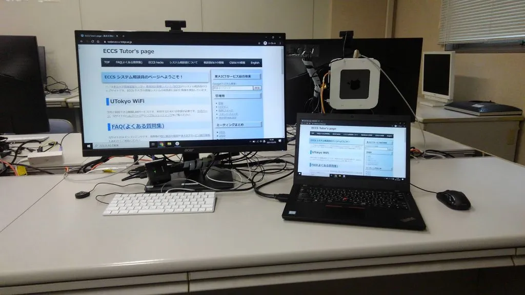 ECCSのMac mini端末に接続されているディスプレイとマウスは,利用者が持ち込んだノートPC等(持ち込みPC)に接続して利用できます(なお,このページで紹介する方法で利用できるのはディスプレイとマウスのみで,キーボードは利用できません).