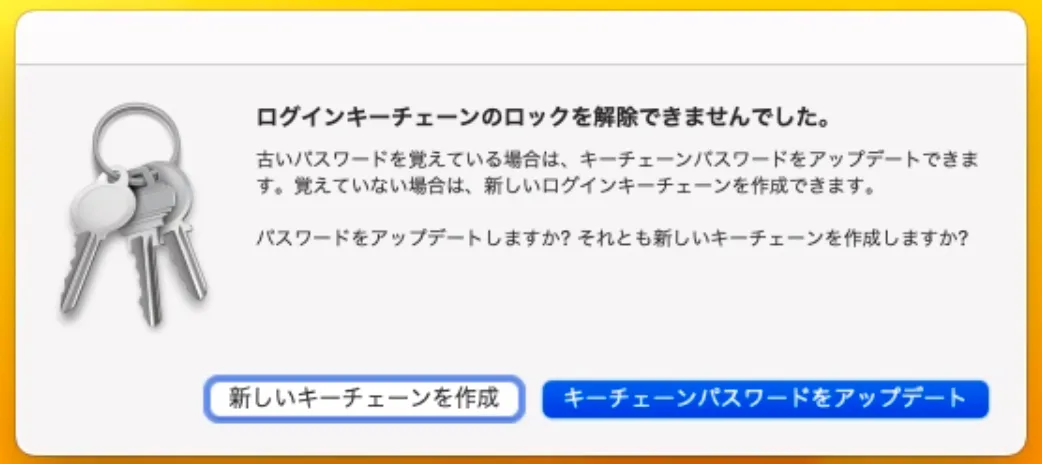 最もシンプルな対処法は,「新しいキーチェーンを作成」をクリックして新しいキーチェーンを作成することです.既存のキーチェーンの内容は失われますが,キーチェーンに何も保存していないなら問題ありません.
