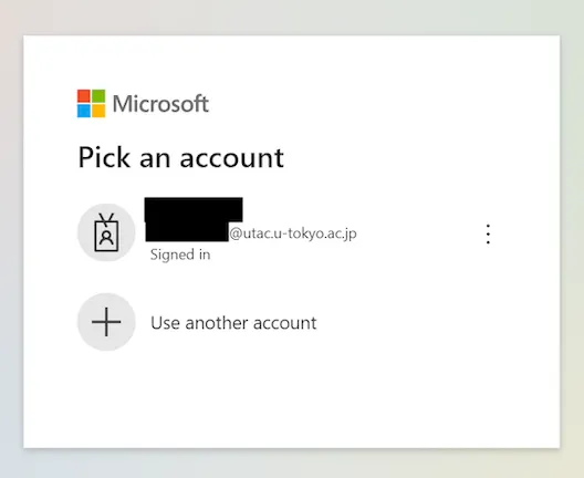 - Select the displayed account name and follow the on-screen instructions to sign in. Depending on the situation, you may be asked to confirm your identity with multi-factor authentication (MFA) or be redirected to the sign-in page with the image of Yasuda Auditorium. For detailed sign-in instructions, please refer to “Sign in to the ICT systems with your UTokyo Account.”