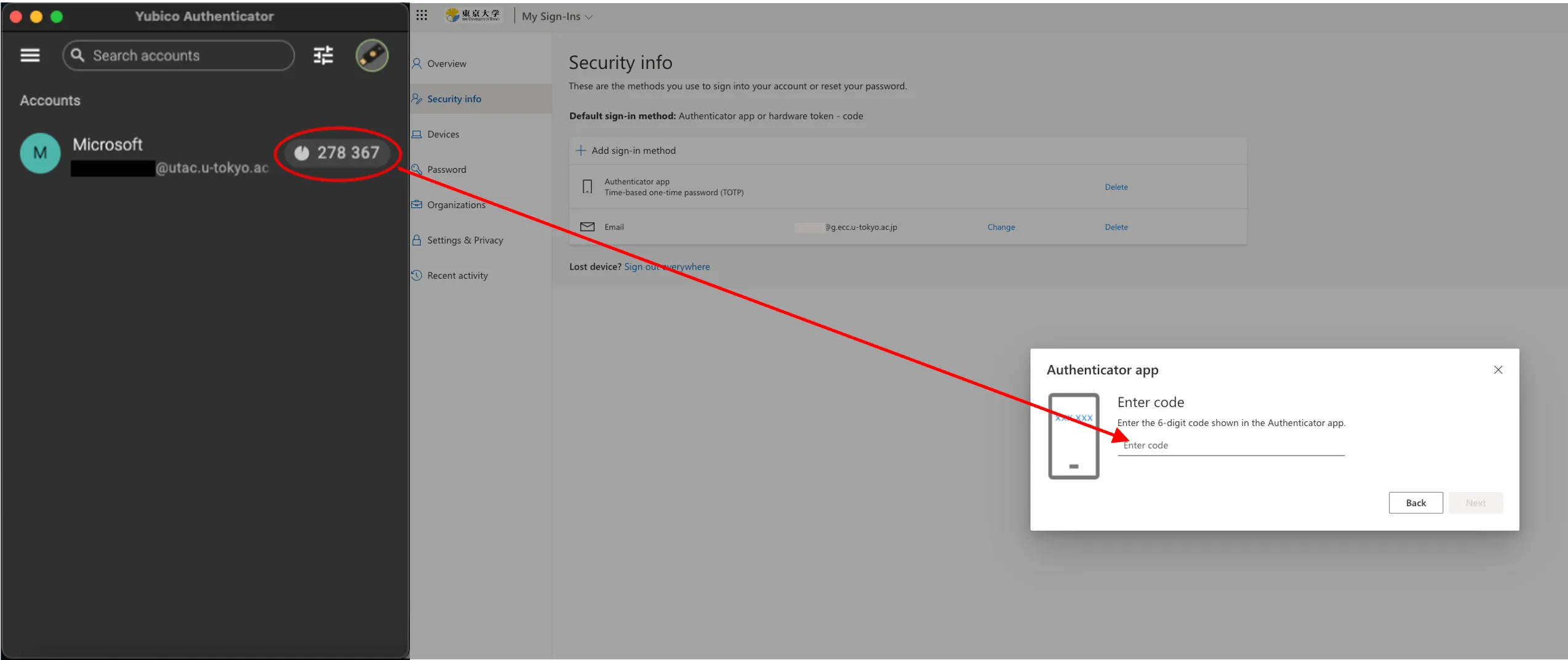 3. When the “Enter code” field is displayed, please open the Yubico Authenticator application with YubiKey connected, check the 6-digit number shown in the app and enter the numbers into the input field.