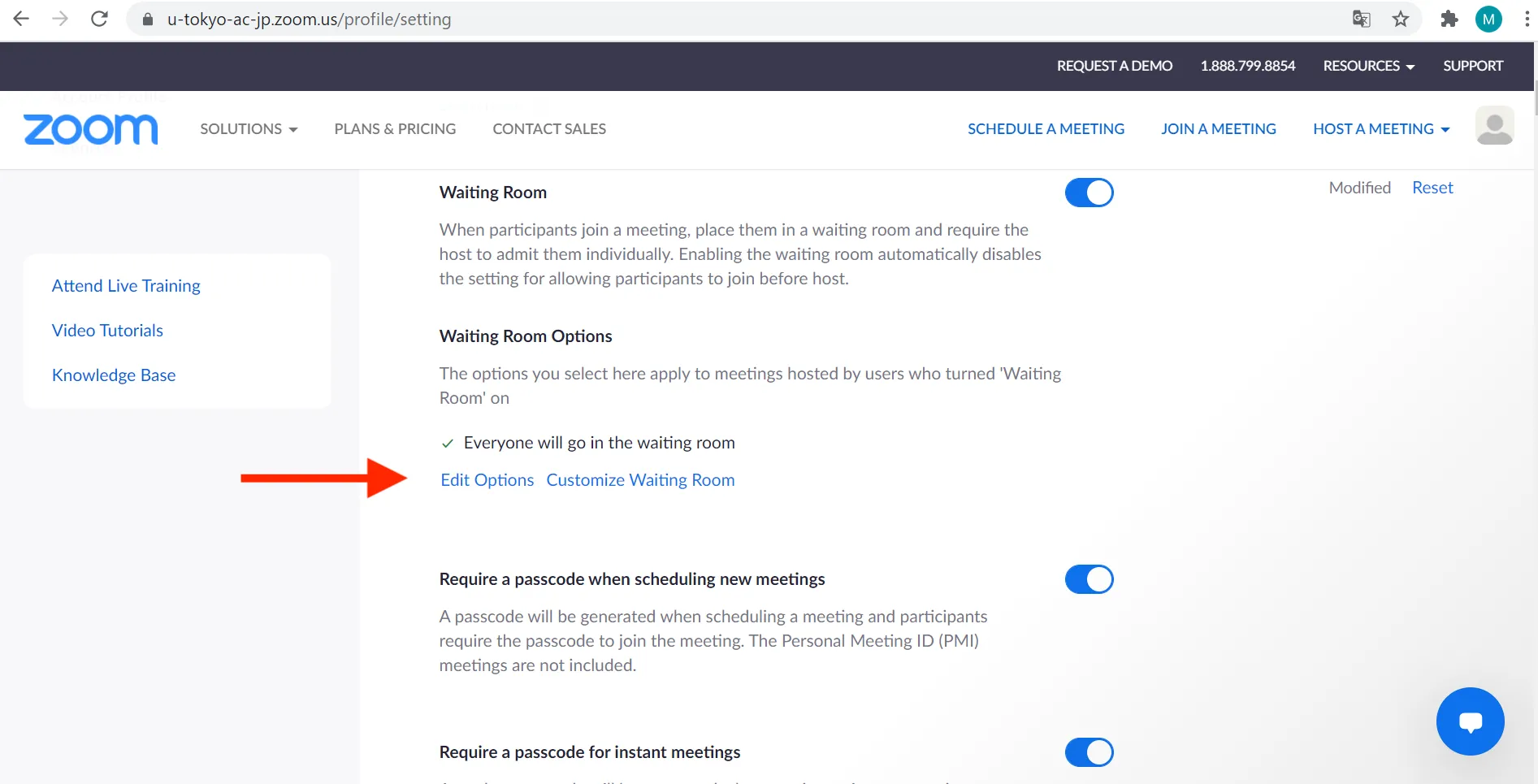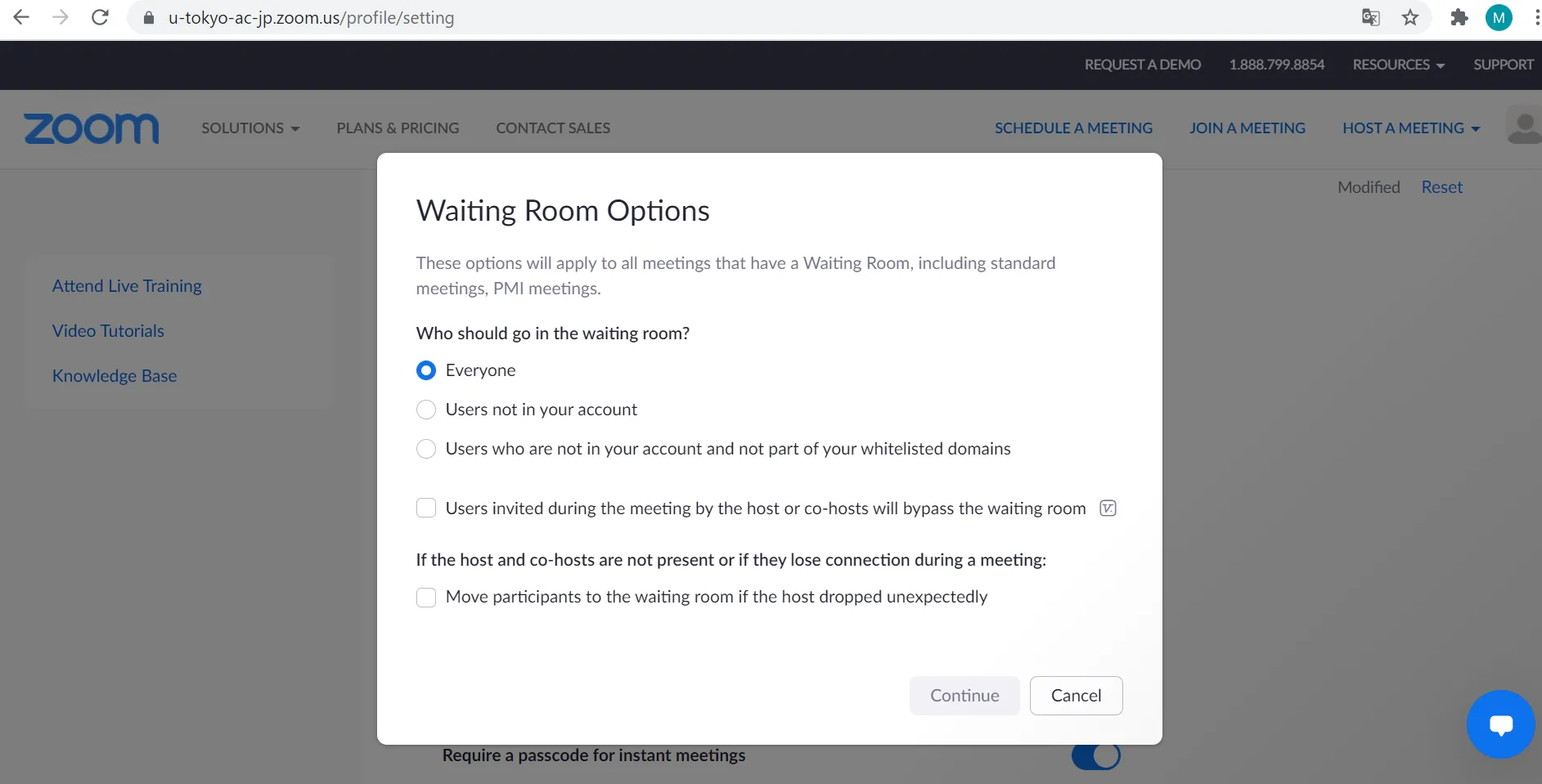 - Allow participants with UTokyo Zoom Account domains to bypass the Waiting Room. Such settings are shared among all meetings. Please double check if the settings are in place before starting a meeting.