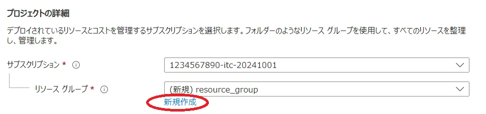 - サブスクリプション:事前に申請したサブスクリプションがすでに設定されていますので、通常はそのままで問題ありません.設定が無い場合はサブスクリプションが作成完了しているかどうか確認ください.