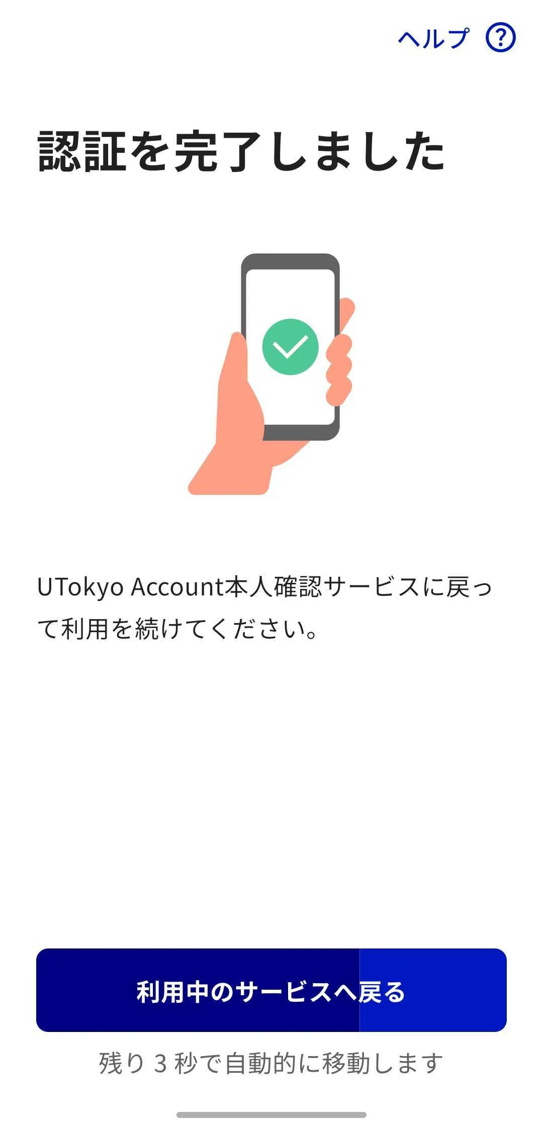 デジタル認証アプリの「利用中のサービスへ戻る」を押すか,画面遷移後10秒経過するのを待ってください.UTokyo Account本人確認サービスへ戻ります.