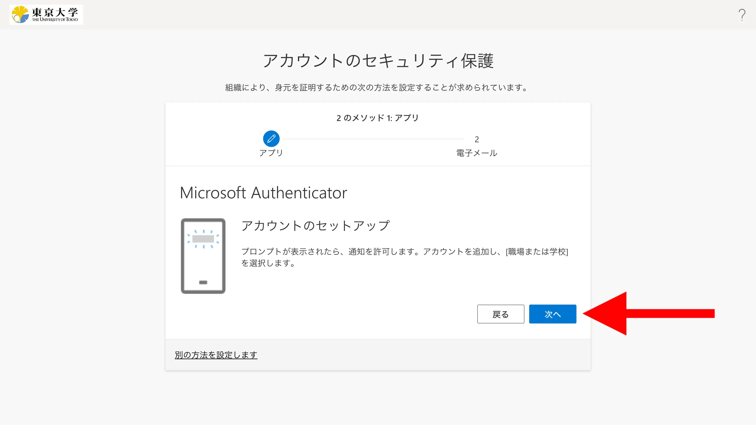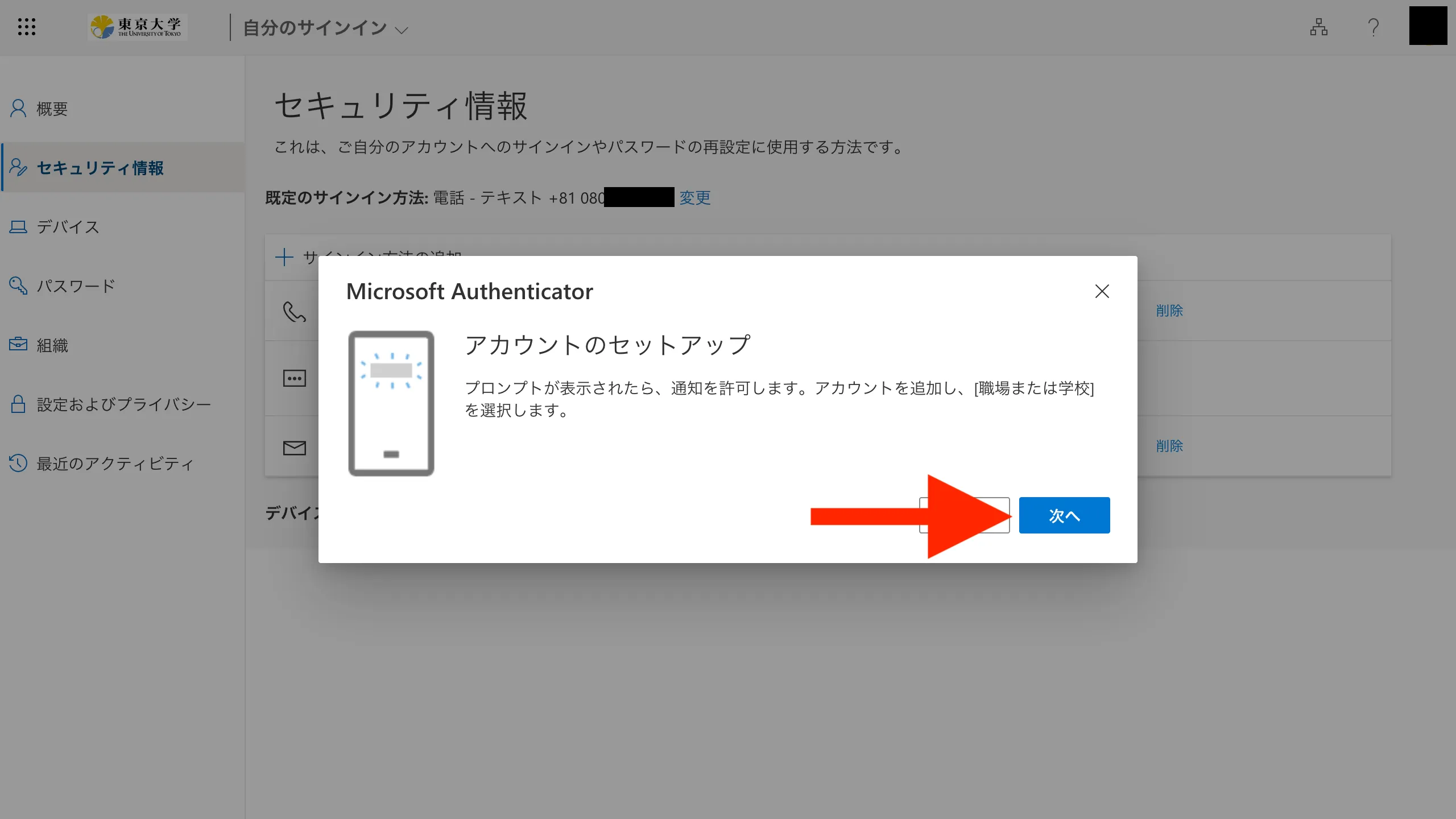 @utac.u-tokyo.ac.jp)とパスワードを入力してください. - 「詳細情報が必要」という画面が表示されるので,「次へ」を押してください.