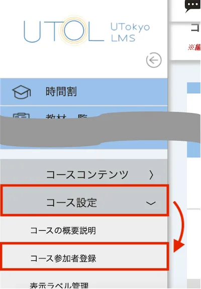 」アイコンを押してください. - 「コース設定」から「コース参加者登録」を選択してください.