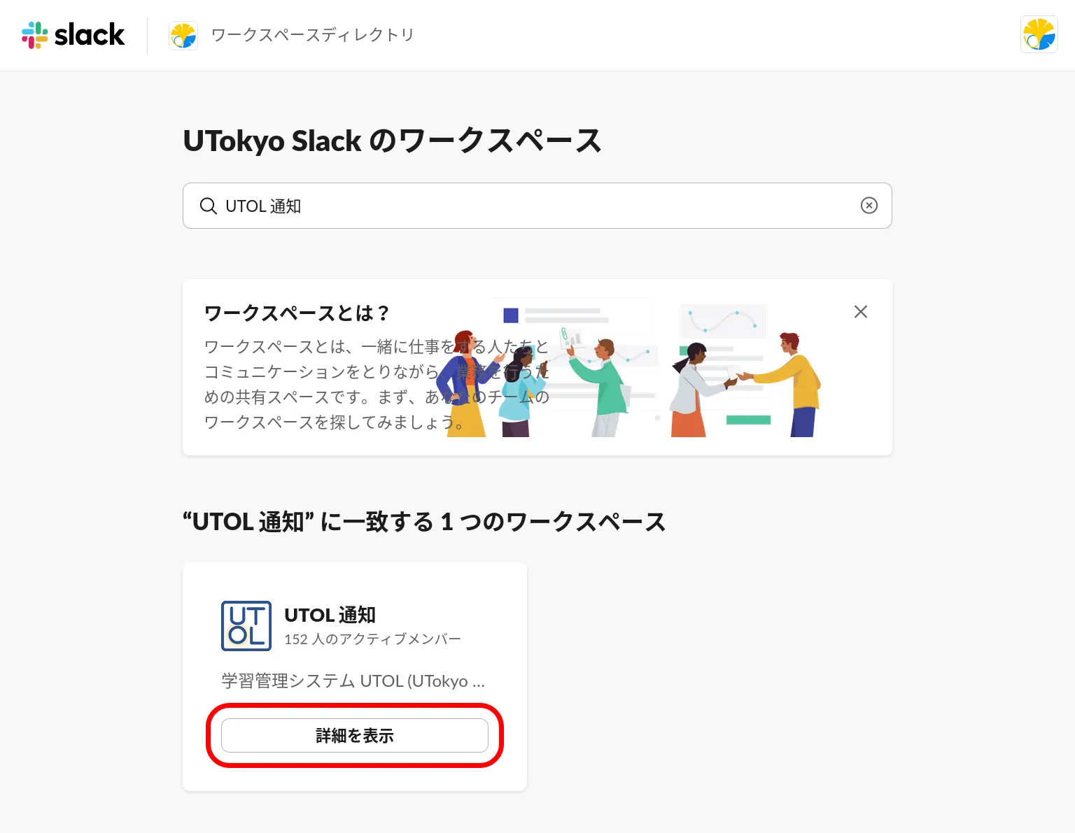 - 「UTokyo Slackに自由に参加できるワークスペースの中から選んで参加する#手順」の5. までを参考に,「UTokyo Slackのワークスペース」という画面を開いてください.