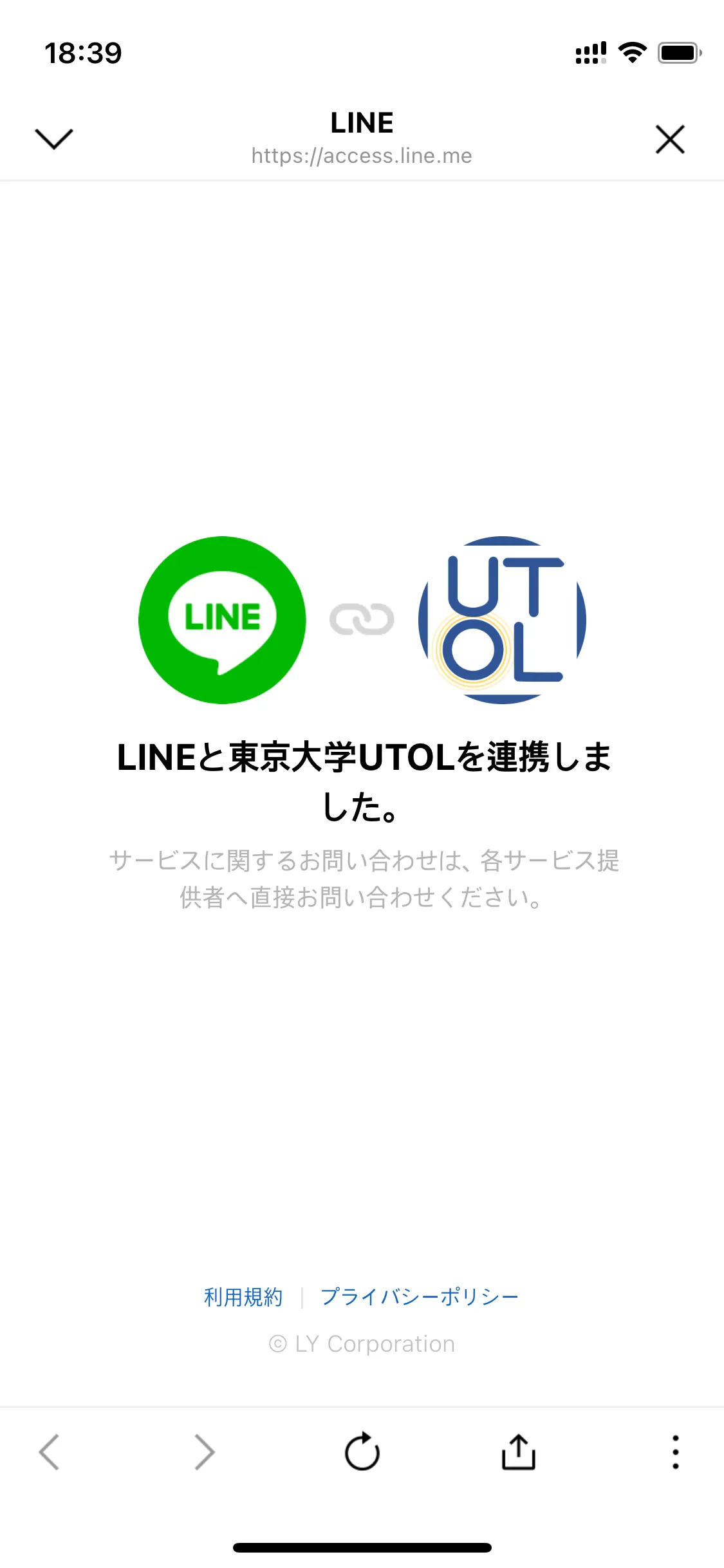 「LINEと東京大学 UTOLを連携しました。」というメッセージが表示されたことを確認してください.
