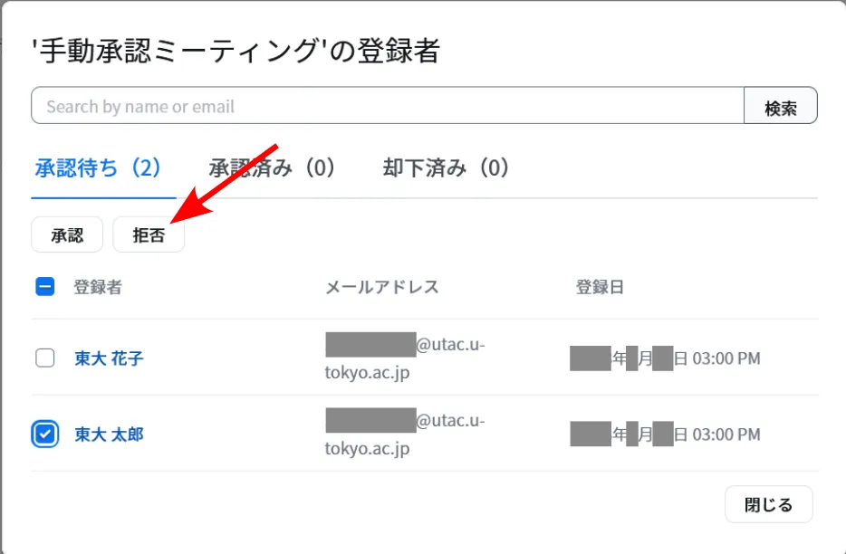 - 拒否したい参加希望者の左にあるチェックボックスをオンにして,「拒否」ボタンを押してください.