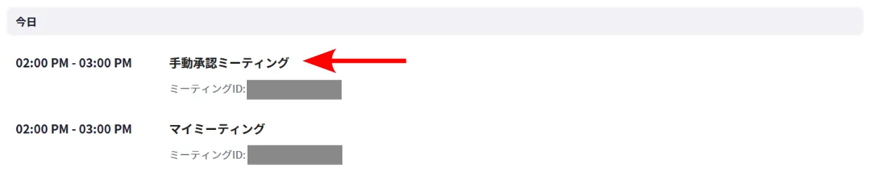 - 自分のスケジュールしたミーティングが,リストとして表示されます.手動承認オプションを有効にしたいミーティングの名前を押してください.
