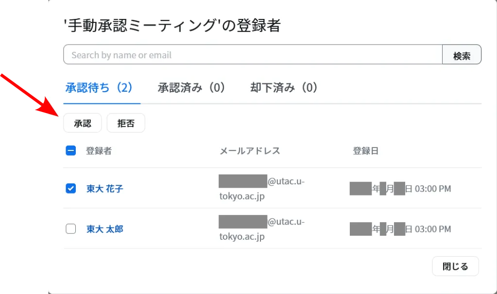 - 承認したい参加希望者の左にあるチェックボックスをオンにして,「承認」ボタンを押してください.