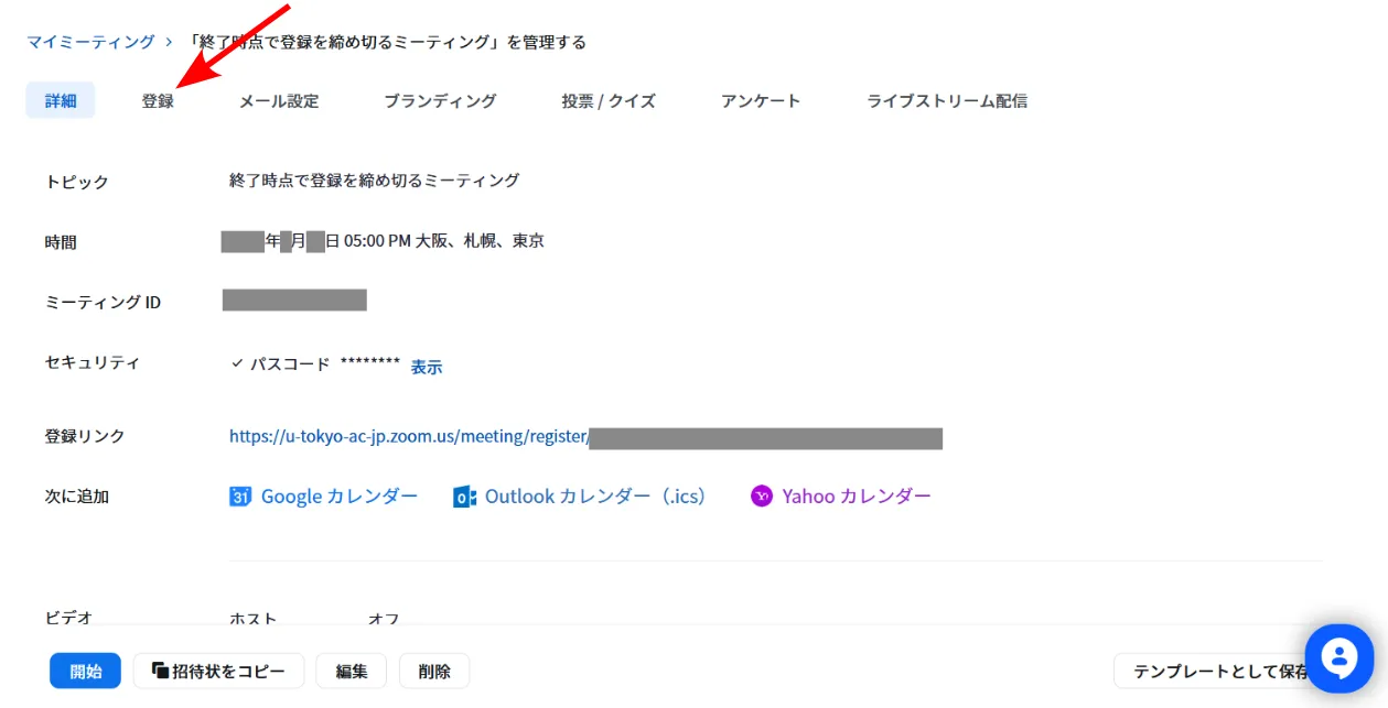 - ミーティングの情報が表示されます.上の方に「登録」「メール設定」等のタブが並んでいます.「登録」タブを選択してください.