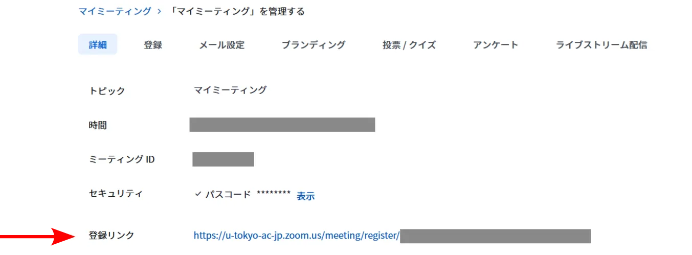 ミーティングの情報が表示されます.上の方に「登録」「メール設定」等のタブが並んでいます.「登録」タブを選択してください.